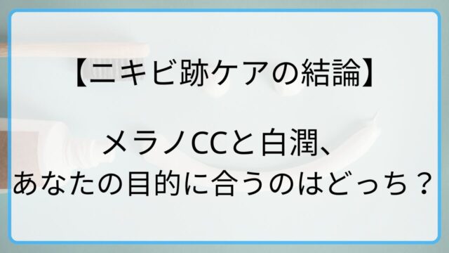 ニキビ跡 【ニキビ跡ケアの結論】メラノCCと白潤、あなたの目的に合うのはどっち? 2025年9月21日 mashino3771 https://mashinoblog.com/wp-content/uploads/2025/04/Mashino_s_Blog-removebg-preview-e1746013225674.png Mashino's Blog 肌野ゆうき ニキビ跡ケアの二大巨頭、メラノCCと白潤…。どっちも有名だけど、一体、何がどう違うんだ?僕の肌には、どっちが合うんだろ …