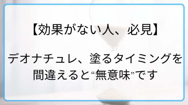 におい対策 【効果がない人、必見】デオナチュレ、塗るタイミングを間違えると“無意味”です 2025年10月9日 mashino3771 https://mashinoblog.com/wp-content/uploads/2025/04/Mashino_s_Blog-removebg-preview-e1746013225674.png Mashino's Blog 肌野ゆうき よし、デオナチュレも買ったし、これで脇のにおい対策は万全だ!朝、出かける前に、サッと塗ればOKだよな! …