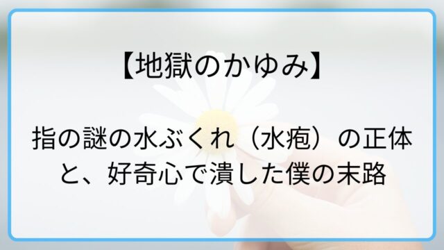 かゆみ 【地獄のかゆみ】指の謎の水ぶくれ(水疱)の正体と、好奇心で潰した僕の末路 2025年9月5日 mashino3771 https://mashinoblog.com/wp-content/uploads/2025/04/Mashino_s_Blog-removebg-preview-e1746013225674.png Mashino's Blog 肌野ゆうき 最近、指先に小さなプツプツができて、すごく気になる…。 別に痛くもかゆくもないけど、この水ぶくれ、一体なんな …