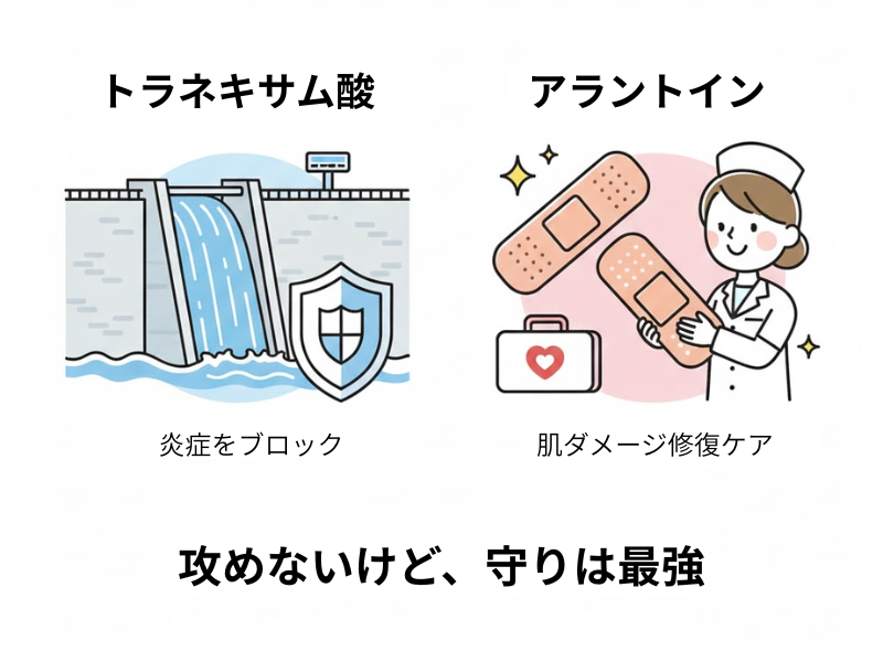 メラノCC(ビタミンC)が「出来てしまった跡を攻める武器」なら、トラネキサム酸は、そもそもシミや色素沈着の“原因”が生まれるのを、上流でせき止めてくれる“鉄壁のダム”のような存在です。