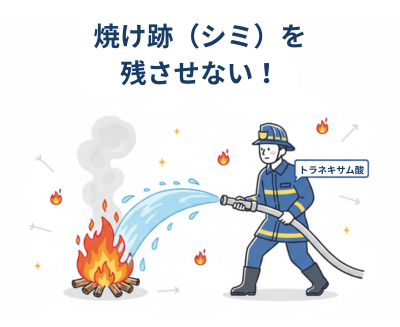 トラネキサム酸の役割は、この「火事(炎症)」を鎮火し、さらに「煙(シミ指令)」が出るのを入り口でブロックすることです。
