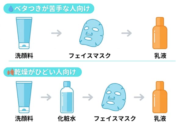 - ベタつくのが嫌な人: 洗顔 → パック(化粧水代わり)でOK。